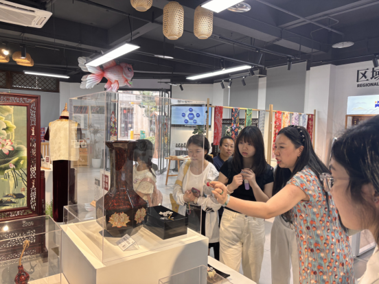 随后,詹颖一行前往文创展陈区,师生们深入考察了融合传统与时尚的成都特色文创精品。詹颖以实物为教材,详细解读了漆器纹样中的古蜀文化密码、银花丝工艺的精密结构以及蜀绣色彩过渡的独特美学,并启发学生思考:“如何提炼这些在地文化符号的精髓,将其创新性地融入现代广告设计与品牌传播实践?”丰富的展品激发了学生们的创作热情,大家纷纷用手机记录细节,为后续设计积累素材。