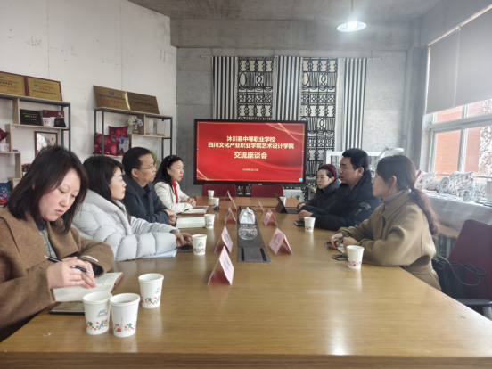 2026年1月15日,沐川县中等职业学校党支部书记、校长张攀率队到访四川文化产业职业学院艺术设计学院,双方围绕非遗文创开发、中高职贯通培养等议题开展深度交流座谈会。艺术设计学院党总支书记郭光海、院长詹颖,教务科牵头人牟娅、对外交流合作专员杨镒、数字媒体艺术设计专业主任李腾出席会议。